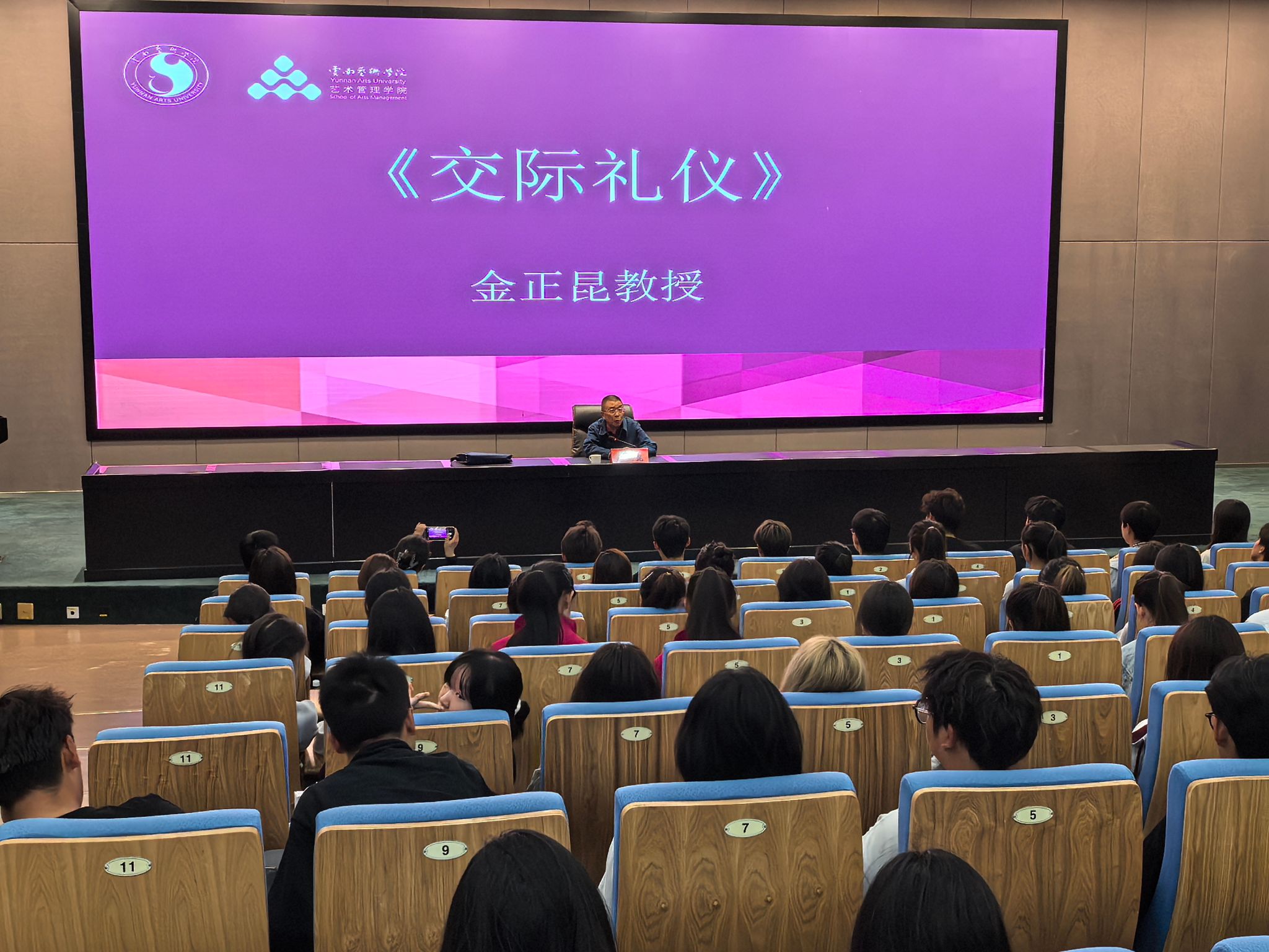 为构建高水平礼仪教育平台、夯实表演专业(礼仪与时尚表演方向)人才培养根基,云南艺术学院艺术管理学院正式推出“尚礼讲坛”品牌活动。2025年9月23日晚,该讲坛首期讲座在图书馆报告厅隆重举行,知名公共关系与礼仪专家、多院校兼职教授金正昆先生应邀莅临,以《交际礼仪》为题带来首场深度分享。