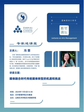 艺术管理学院艺术管理专业是云南省一流本科专业,专业建设过程中持续进行专业课程教育模式改革,邀请学界和业界名师为本科生授课,拓展学生的知识面。依据艺术管理专业“1+1”教学模式开展的要求,学院于2025年11月3日下午邀请云南广播电视台融媒体新闻中心宣传规划部主任冯茵老师以《与这个世界狠狠地共鸣 —— 媒体融合时代传统媒体转型的机遇与挑战》为题,开展学术讲座。讲座由任课教师吴婉婷主持,2024级艺术管理专业全体学生参加。