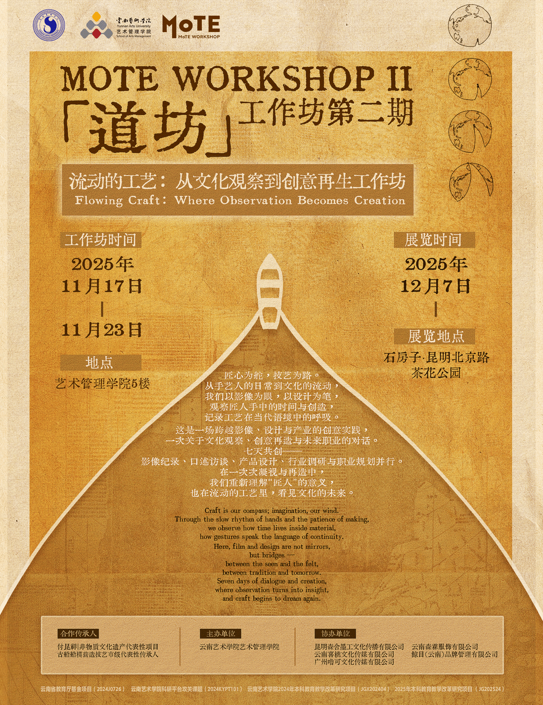 「道坊」工作坊是艺术管理学院在实践教学模式改革中的重要探索。本期工作坊进一步深化了“文化+影像+设计”的跨学科融合路径,为培养兼具文化洞察力、创意表达能力与行业适应力的复合型人才奠定坚实基础。