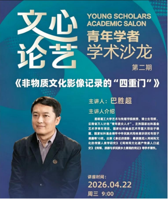 为深化非物质文化遗产保护研究、推动艺术管理与传媒人类学、影像民族志交叉融合,助力学院构建学科体系、学术体系、话语体系,2026 年 4 月 22 日上午 9 时,云南艺术学院艺术管理学院研究生学术品牌活动——“文心论艺・青年学者学术沙龙”第二期在图书馆会议室顺利举行。本次讲座特邀昆明理工大学艺术与传媒学院巴胜超教授,以《非物质文化遗产影像记录的“四重门”》为主题,为学院师生带来一场兼具理论深度、田野实践厚度与创作指导价值的学术分享。